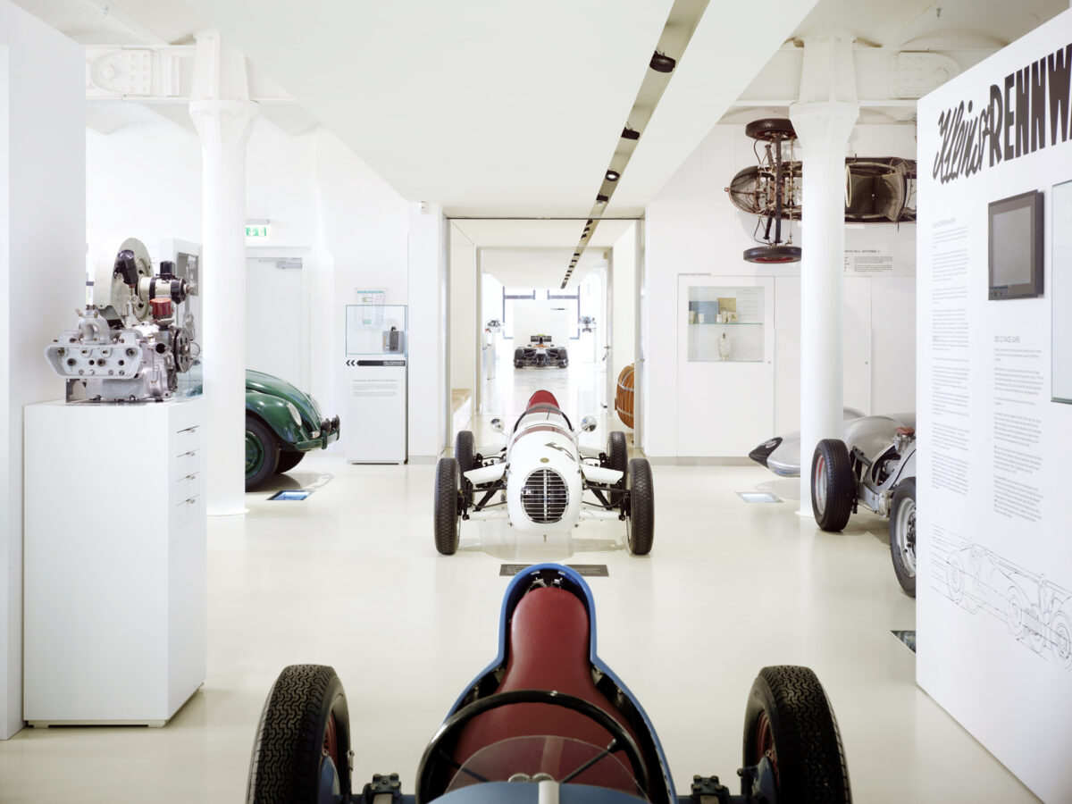 Sich zeigen auf den zweieinhalbtausend Quadratmetern dürfen sich nur ganz besondere Autos, wie der berühmte „Berlin-Rom-Wagen“ von Porsche (Typ 64), der Weltrekordwagen von Petermax Müller aus dem Jahr 1950 oder der Formel-1-Rennwagen von Jordan, mit dem Michael Schumacher sein Debüt gab. Einmalig! Einmalig! Einmalig! Das ist das entscheidende Kriterium. Nicht alle sind deshalb Prototypen im ursprünglichen Sinn. Aber immer handelt es sich Klassiker.