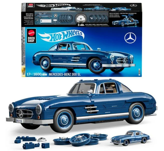 Der Mercedes-Benz 300 SL „Flügeltürer“ ist ein Sportwagen des Jahrhunderts, Originale sind heute beinahe unbezahlbar. Das gilt nicht für den Bausatz von Mattel aus der neuen Reihe „Brick Shop“. Das zu Legosteinen kompatible SL-Set besteht aus rund 1.600 Elementen. Daraus entsteht dann ein blauer 300 SL im Maßstab 1:12, das fertige Modell ist 36 Zentimeter lang und bietet jede Menge authentischer Details. Neben den Flügeltüren zum Öffnen zählen dazu auch verschiedene Räder, mit Rudge-Zentralverschluss oder Metall-Radkappen. Bauelemente aus Metall wie der typische SL-Kühlergrill zeichnen das Set gegenüber anderen Bausätzen aus Kunststoff-Klemmbausteinen aus.