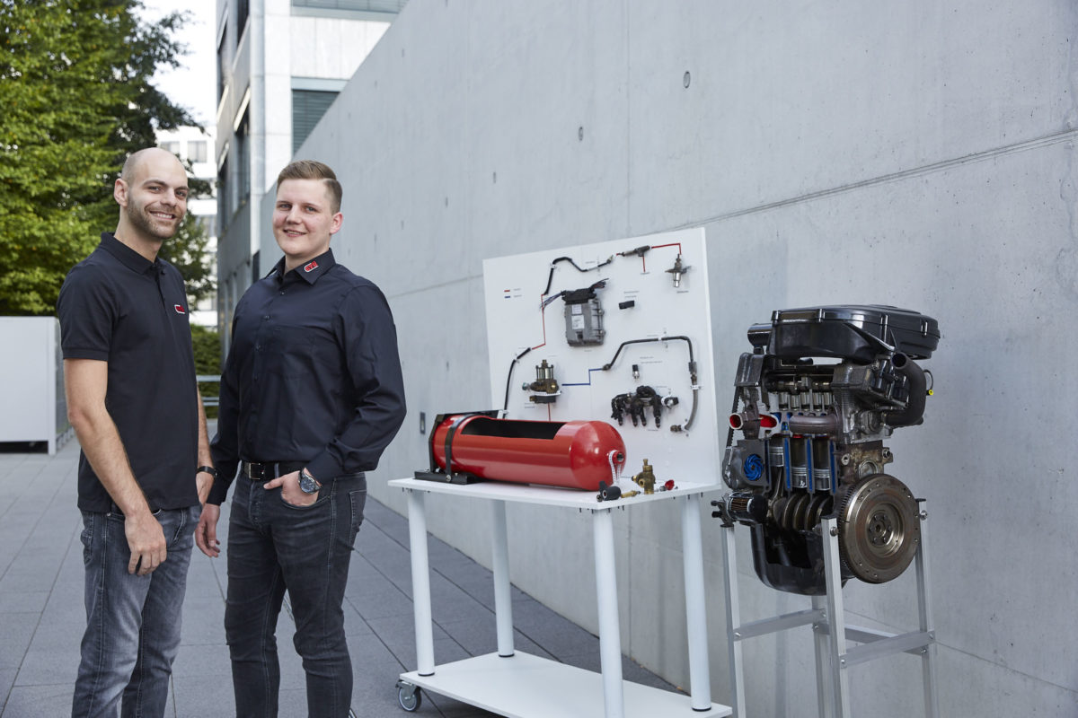 Zwei angehende Prüfingenieure der GTÜ präsentieren im Rahmen der GTÜ-Nachwuchsförderung das Schnittmodell eines Verbrennungsmotors und eine anschaulich dargestellte Erdgasanlage.